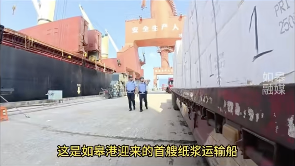 Stills from a video on Douyin — the Chinese version of TikTok — that documents a delivery of pulp from Phoenix to Asia Symbol’s factory in Rugao. The videos celebrated the first use of an an expedited customs process by Asia Symbol. By the end of November, Phoenix Resources International had shipped 183,000 tonnes of pulp to this dock, which stands a short distance from Asia Symbol’s plant.