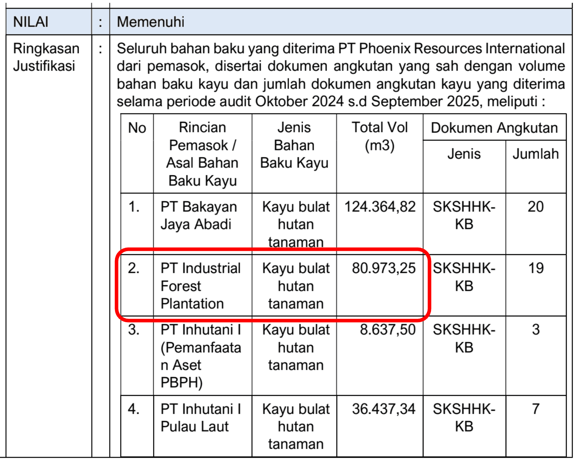 The provenance of the wood Phoenix was sourcing was available in audit reports. An audit was carried out in December 2024 and named just seven suppliers — including Industrial Forest Plantation, by then one of the most notorious companies in the pulp sector. The report has been available online since at least February 2025.